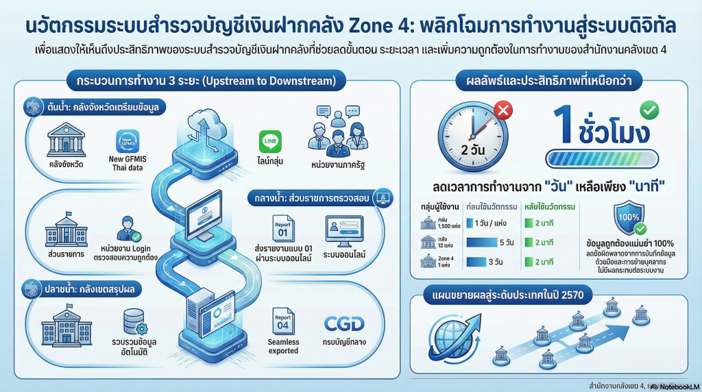 ระบบสำรวจเงินฝากคลังเขต 4 ไม่ใช่แค่เครื่องมือการทำงานแต่คือการสร้าง ecosystem ดิจิทัลที่โปร่งใส ตรวจสอบได้และพร้อมขยายผลสู่ระดับประเทศ เพื่อการบริหารจัดการทรัพยากรภาครัฐอย่างยั่งยืน